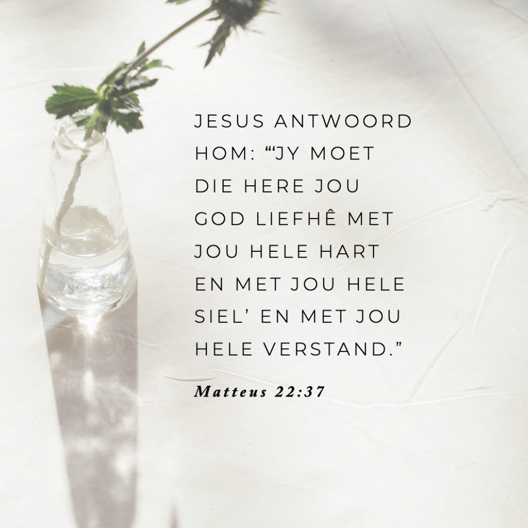 Ek weet daar is dae wanneer dit voel of ons wêreld teen 'n onstuitbare pas draai. Werkvergaderings, sportoefeninge en ons alledaagse doenlysies oorweldig ons dikwels, wat dit maklik maak om dít wat werklik saak maak, uit die oog te verloor. Tog, te midde van dit alles, roep Jesus ons tot 'n dieper verhouding met Hom en herinner ons dat die belangrikste gebod is om God lief te hê.