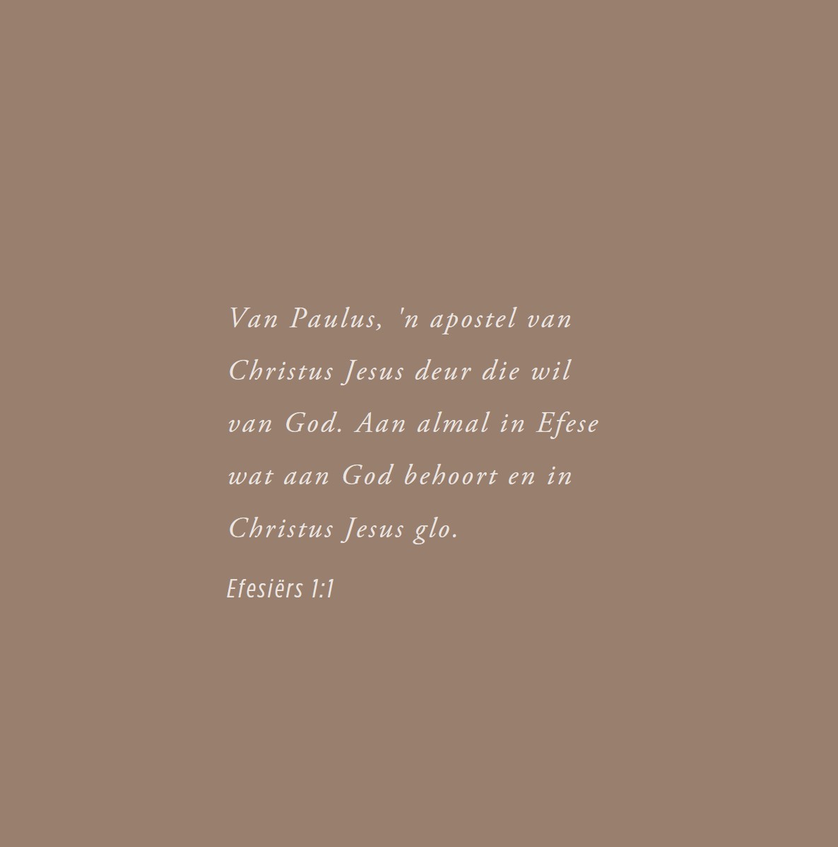 Van Paulus, ‘n apostel van Christus deur die wil van God. Aan almal in Efese wat aan God behoort en in Christus Jesus glo. AFR83