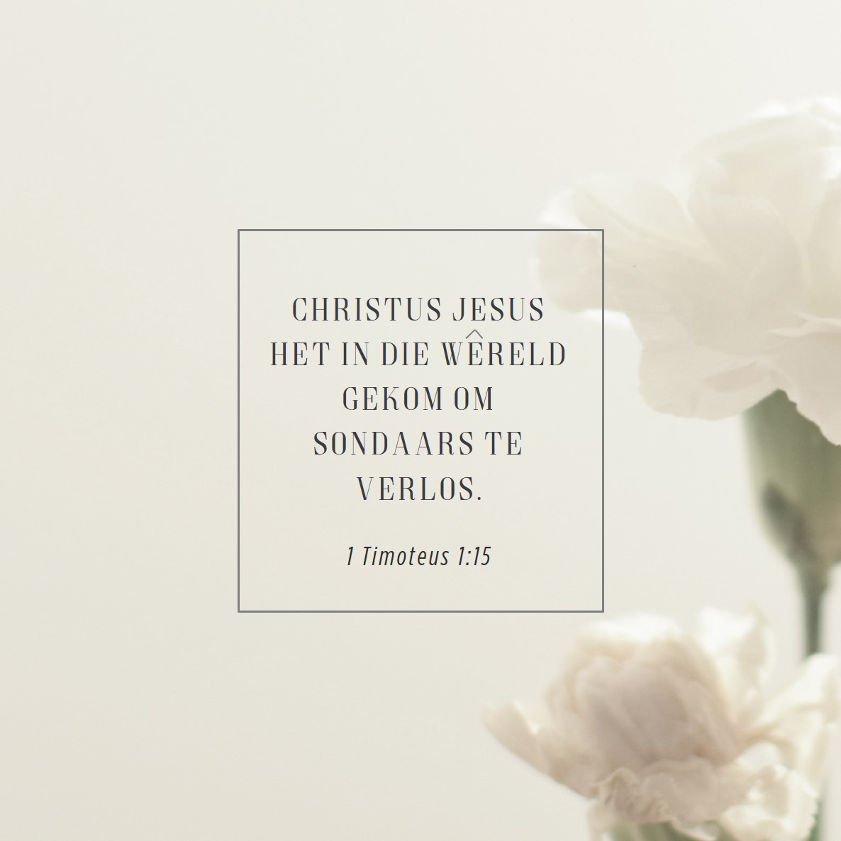 Dit is 'n betroubare woord en kan sonder voorbehou aanvaar word: Christus Jesus het in die wêreld gekom om sondaars te verlos. Maar juis daarom was God my genadig sodat Christus Jesus aan my, as die grootste sondaar, al sy verdraagsaamheid sou betoon en ek 'n voorbeeld kon wees vir almal wat in die toekoms in Hom sou glo om die ewige lewe te verkry.