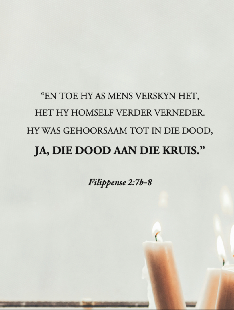 “En toe Hy as mens verskyn het, het Hy Homself verder verneder. Hy was gehoorsaam tot in die dood, ja, die dood aan die kruis.”