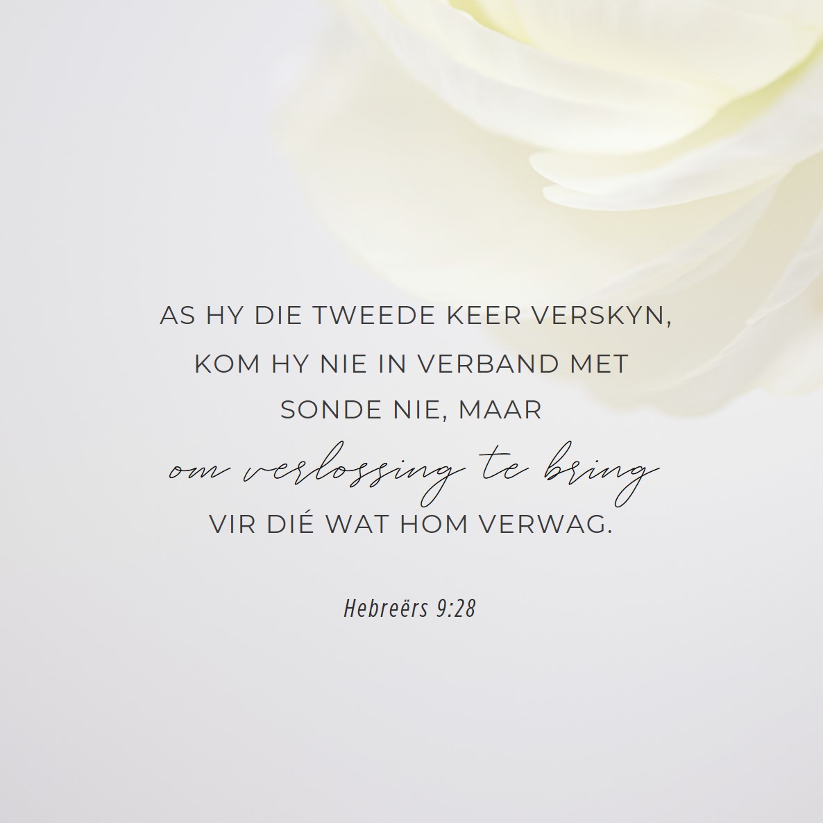 So is Christus ook net een maal geoffer om die sondes van baie weg te neem. As Hy die tweede keer verskyn, kom Hy nie in verband met sonde nie, maar om verlossing te bring vir dié wat Hom verwag.