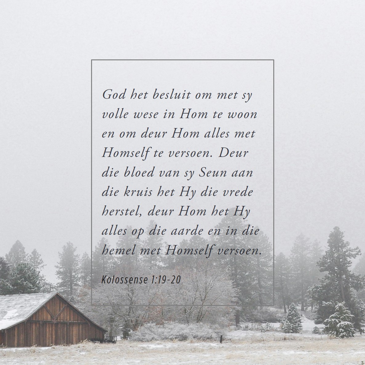 God het besluit om met sy volle wese in Hom te woon en om deur Hom alles met Homself te versoen. Deur die bloed van sy Seun aan die kruis het Hy die vrede herstel, deur Hom het Hy alles op die aarde en in die hemel met Homself versoen.