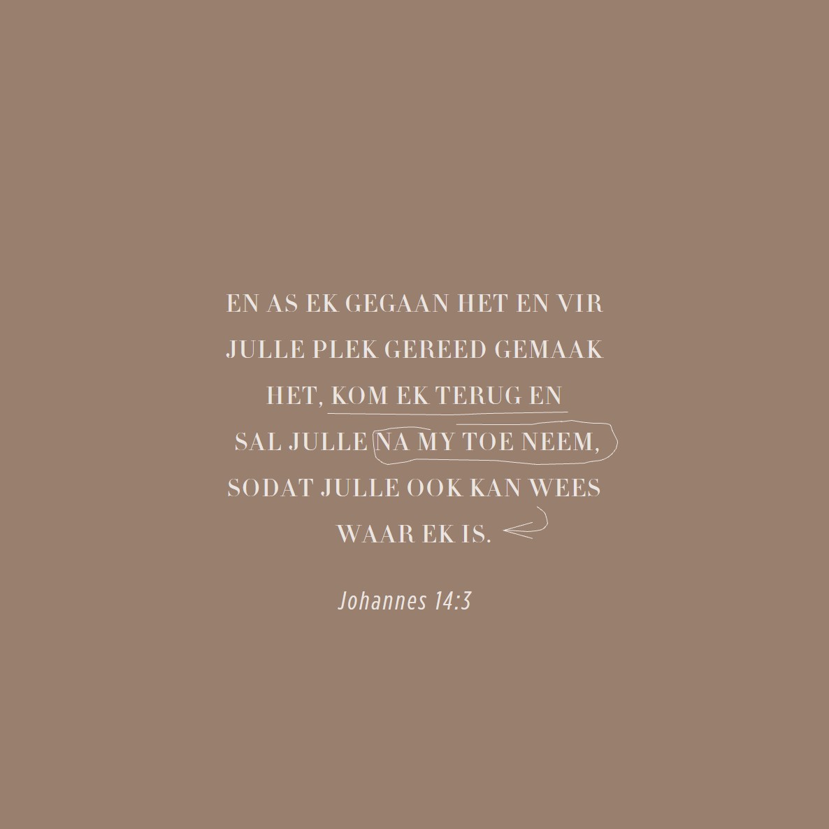 “Julle moet nie ontsteld wees nie. Glo in God; glo ook in My. In die huis van my Vader is daar baie woonplek. As dit nie so was nie, sou Ek nie vir julle gesê het Ek gaan om vir julle plek gereed te maak nie. En as Ek gegaan het en vir julle plek gereed gemaak het, kom Ek terug en sal julle na My toe neem, sodat julle ook kan wees waar Ek is.”