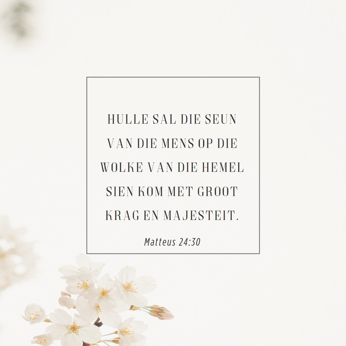 Dan sal die teken van die Seun van die mens in die hemelruim verskyn, en al die volke van die aarde sal verslae wees. Hulle sal die Seun van die mens op die wolke van die hemel sien kom met groot krag en majesteit. Die groot trompet sal weerklink en Hy sal sy engele uitstuur om sy uitverkorenes bymekaar te maak uit die vier windstreke, van elke uithoek van die aarde af.