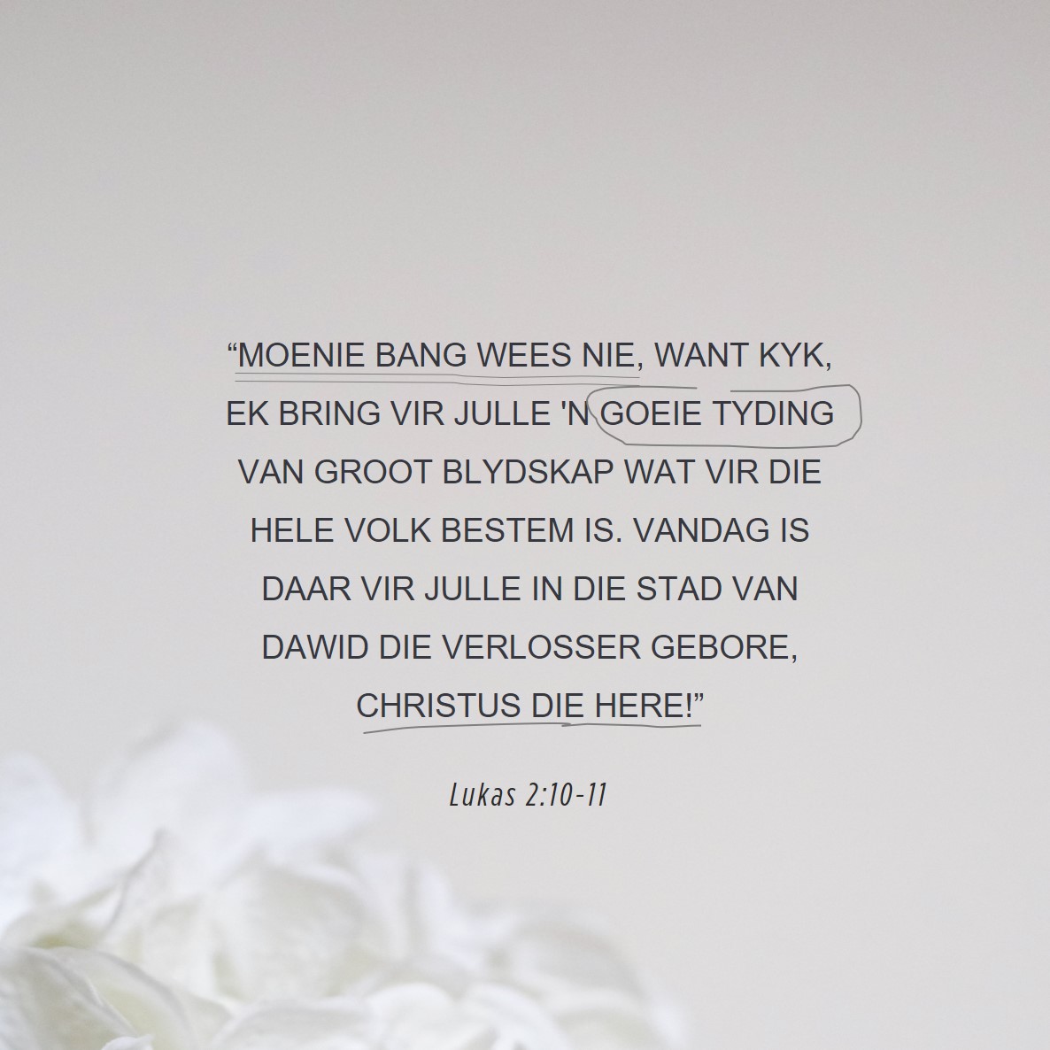 Toe sê die engel vir hulle: “Moenie bang wees nie, want kyk, ek bring vir julle 'n goeie tyding van groot blydskap wat vir die hele volk bestem is. Vandag is daar vir julle in die stad van Dawid die Verlosser gebore, Christus die Here!”