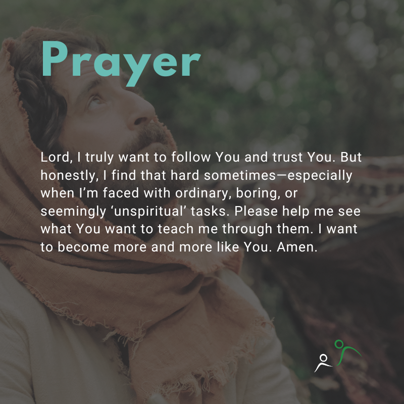 "Lord, I truly want to follow You and trust You. But honestly, I find that hard sometimes- especially when I'm faced with ordinary, boring, or seemingly 'unspiritual' tasks. Please help me see what You want to teach me through them. I want to become more and more like You. Amen."