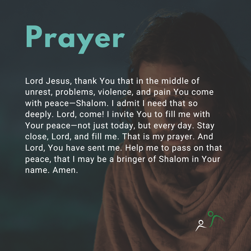"Lord Jesus, thank You that in the middle of unrest, problems, violence, and pain You come with peace - Shalom. I admit I need that so deeply. Lord, come! I invite You to fill me with Your peace - not just today, but every day. Stay close, Lord, and fill me. That is my prayer. And Lord, You have sent me. Help me to pass on that peace, that I may be a bringer of Shalom in Your name. Amen."