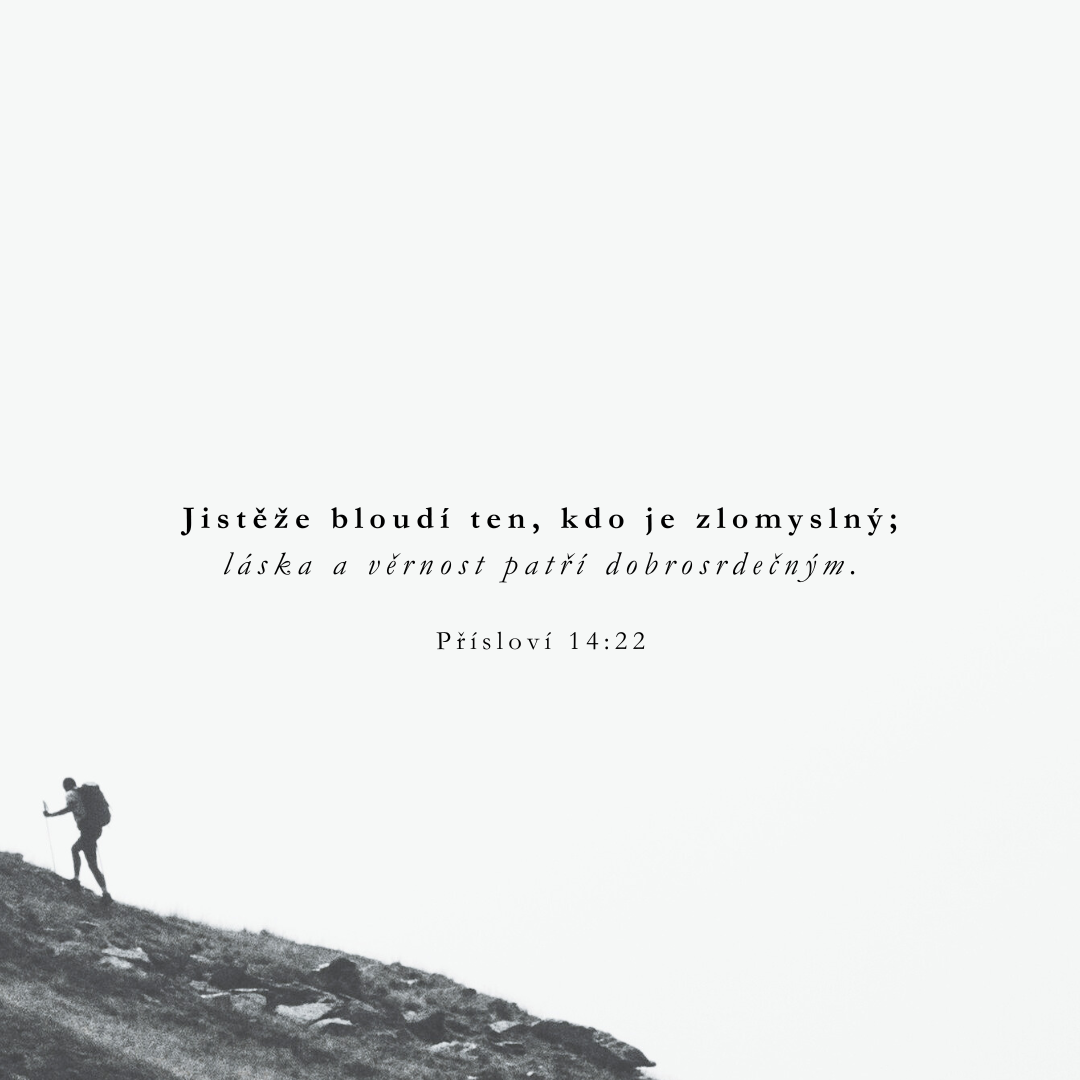 Hřích se dokáže do našich životů vkrádat, když to nejméně čekáme, zvláště když se soustředíme sami na sebe. Když je naše srdce pohlceno pudem sebezáchovy nebo ctižádostí, můžeme snadno polevit v ostražitosti a ospravedlňovat si drobné kompromisy na cestě. Přísloví 14:22 nám však připomíná, že ti, kdo vymýšlejí dobro, kdo hledají, co je správné a Bohu milé, naleznou pevnou lásku a věrnost. Bůh slibuje, že když upřeme svůj pohled na to, co je čisté a pravdivé, setkáme se s Jeho neochvějnou láskou.