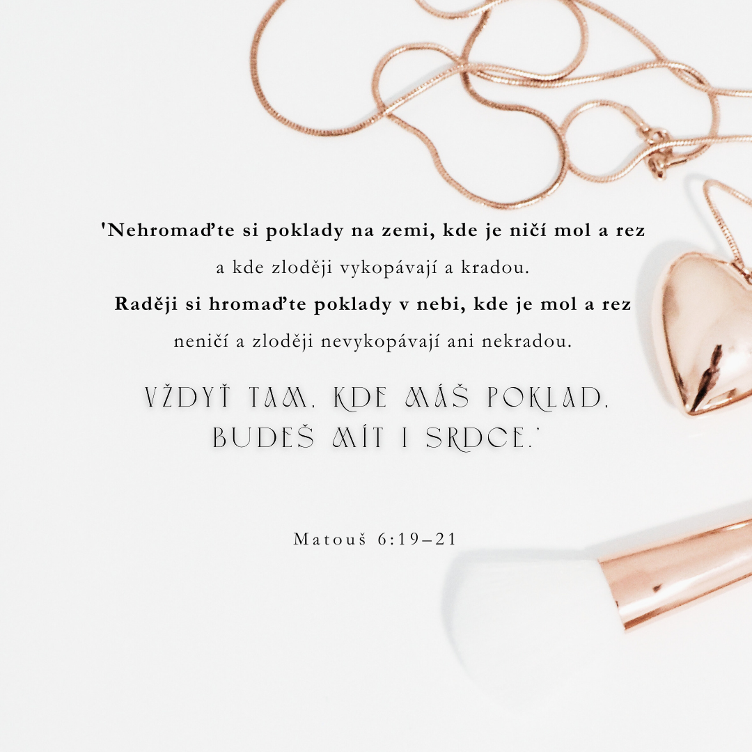 Ježíš nám ale v Matoušovi 6:19–21 ukazuje jinou cestu. Říká nám, abychom nehromadily naše poklady na zemi, kde se nakonec vytratí, ale abychom se zaměřily na poklady věčné — takové, které trvají navěky. Jaké jsou tyto poklady? Boží Slovo a duše lidí. Toto jsou věci, které jsou pro věčnost důležité, a nic je nemůže zničit. Jako křesťané jsme zváni investovat do těchto trvalých pokladů, místo abychom se nechali pohltit dočasnými požitky tohoto světa.