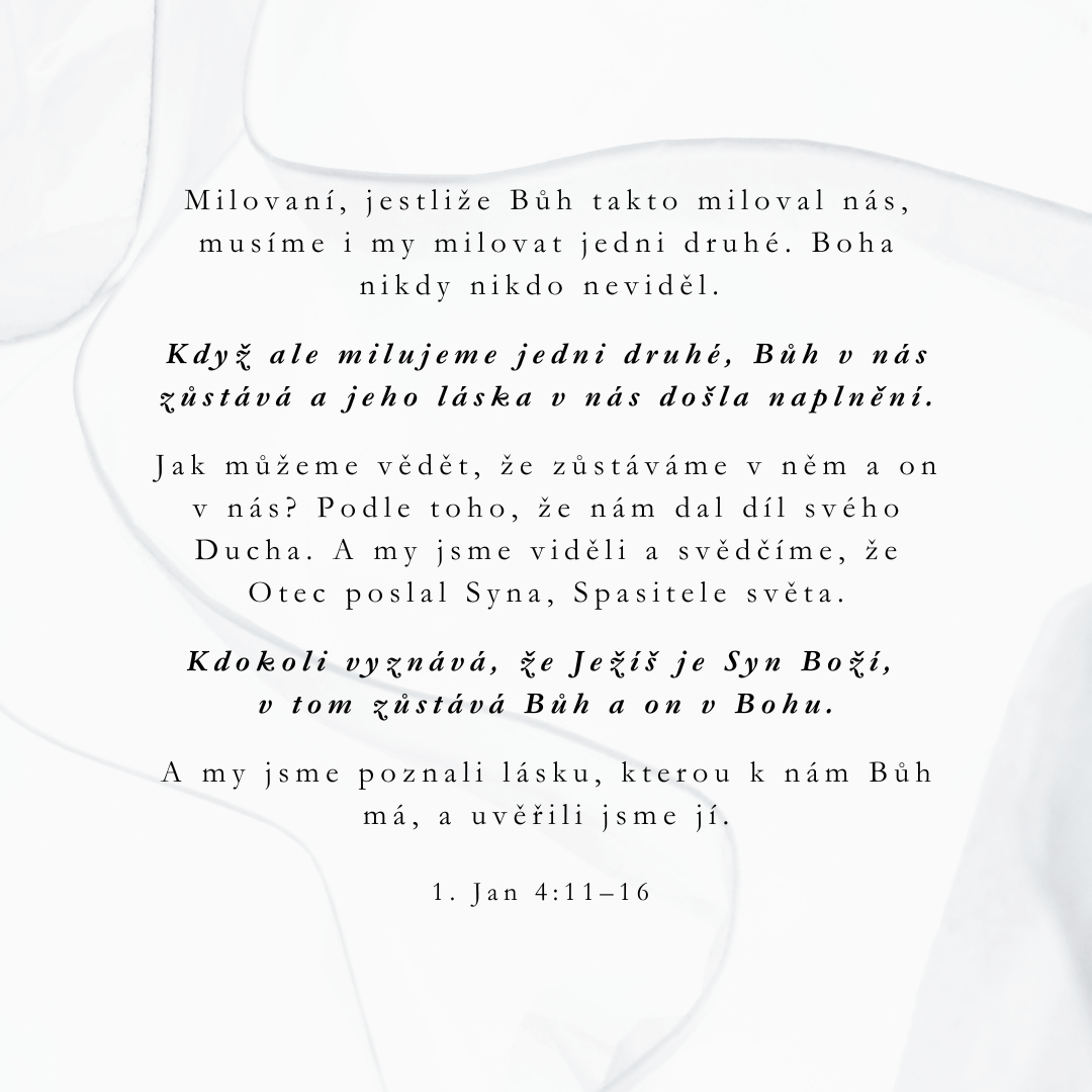 Drahý Ježíši, děkuji Ti za Tvou hlubokou a dokonalou lásku. Pomoz mi v této lásce každý den setrvávat a nechat ji skrze sebe proudit k druhým. Amen.
