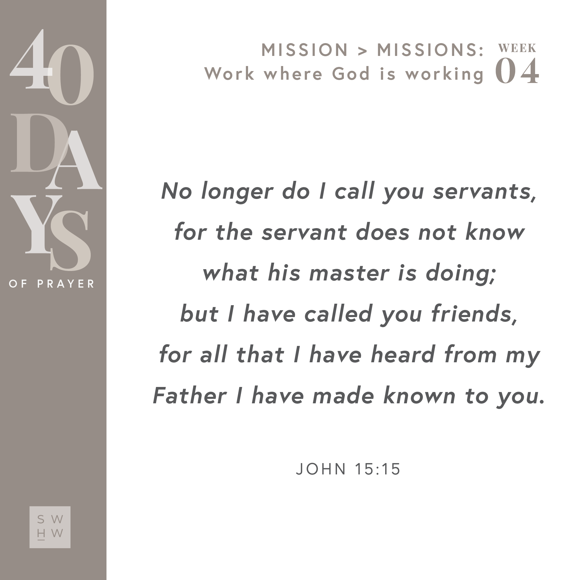 “No longer do I call you servants, for the servant does not know what his master is doing; but I have called you friends, for all that I have heard from my Father I have made known to you.” - John 15:15