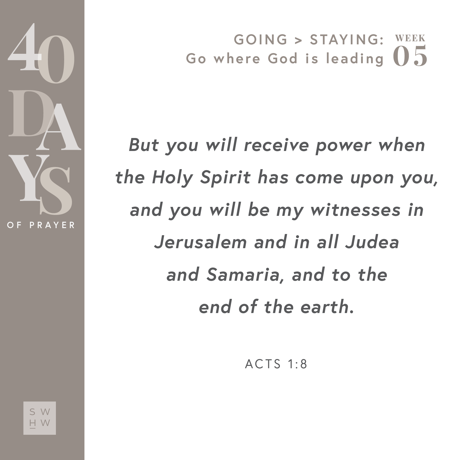“But you will receive power when the Holy Spirit has come upon you, and you will be my witnesses in Jerusalem and in all Judea and Samaria, and to the end of the earth.” - Acts 1:8