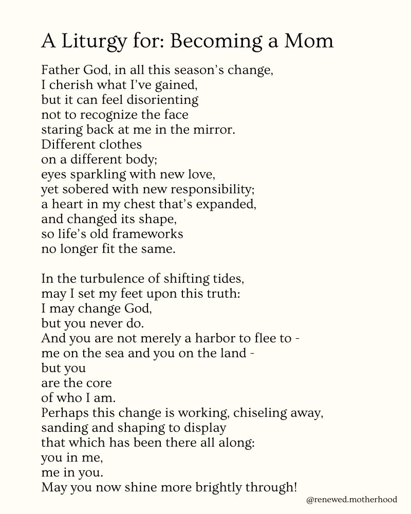 With this liturgy for becoming a mom, I pray it serves to be an anchor to you in whatever sea of change you find yourself - in the newborn days or the years that come after - for we are always “becoming” as moms. From day one and each day thereafter, we are transformed by this journey of nurturing young lives. And throughout it all, may we cling to the one reality, the one part of us, that is certain to never change: Jesus, and his permanent dwelling within us.