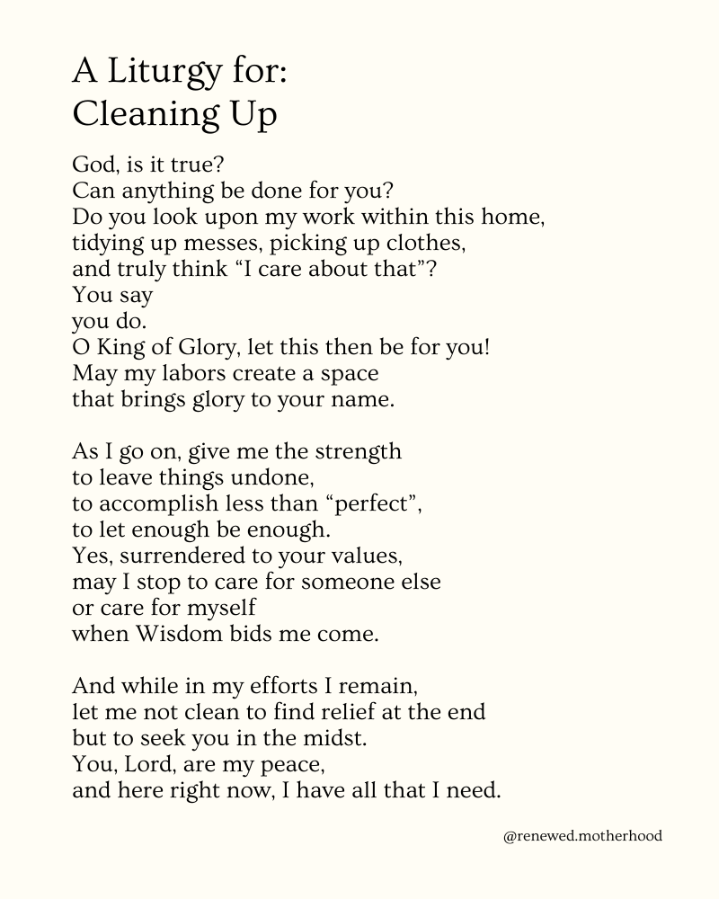 According to Colossians, we are working for the Lord, and this work is all-inclusive: “whatever you do.” So yes, cleaning up can be an act of worship offered unto the Lord. Yes, cleaning up has ties to an eternal inheritance! When we clean from a heart position of serving the Lord and serving those he has put into our care, God is glorified. God does care about our unseen labor, and if he cares, then I can trust there is meaning embedded within.