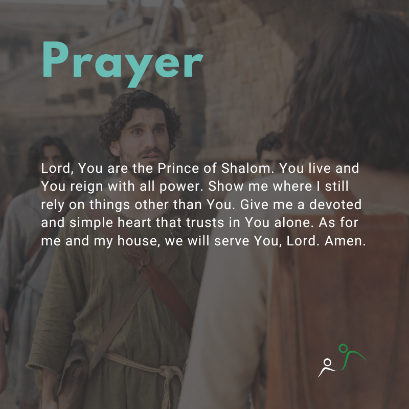 Lord, You are the Prince of Shalom. You live, and You reign with all power. Show me where I still rely on things other than You. Give me a devoted and simple heart that trusts in You alone. As for me and my house, we will serve You, Lord. Amen.