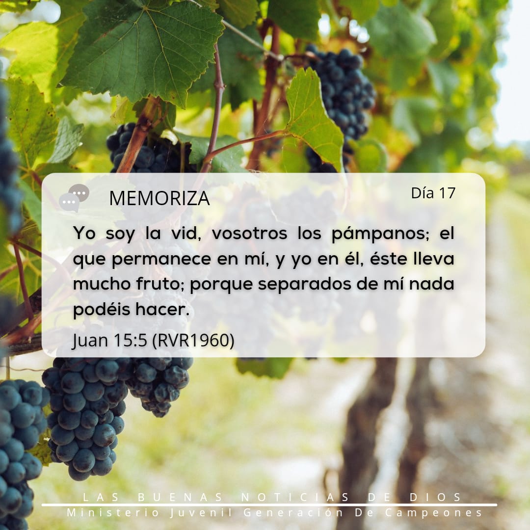A través de este pasaje nos damos cuenta de la dependencia que tenemos de Jesús para dar frutos. Para ser productivos, necesitamos mantener una comunión con Él. Tal vez por nuestros propios esfuerzos alcancemos metas y sentir cierta realización personal, pero probablemente no sean los frutos que Él desee producir en nuestras vidas. Esos mismos frutos demostrarán que tan unidos estamos a la Vid. En todo y para todo, Jesús. (Líder Juvenil: Laura Douglas)
