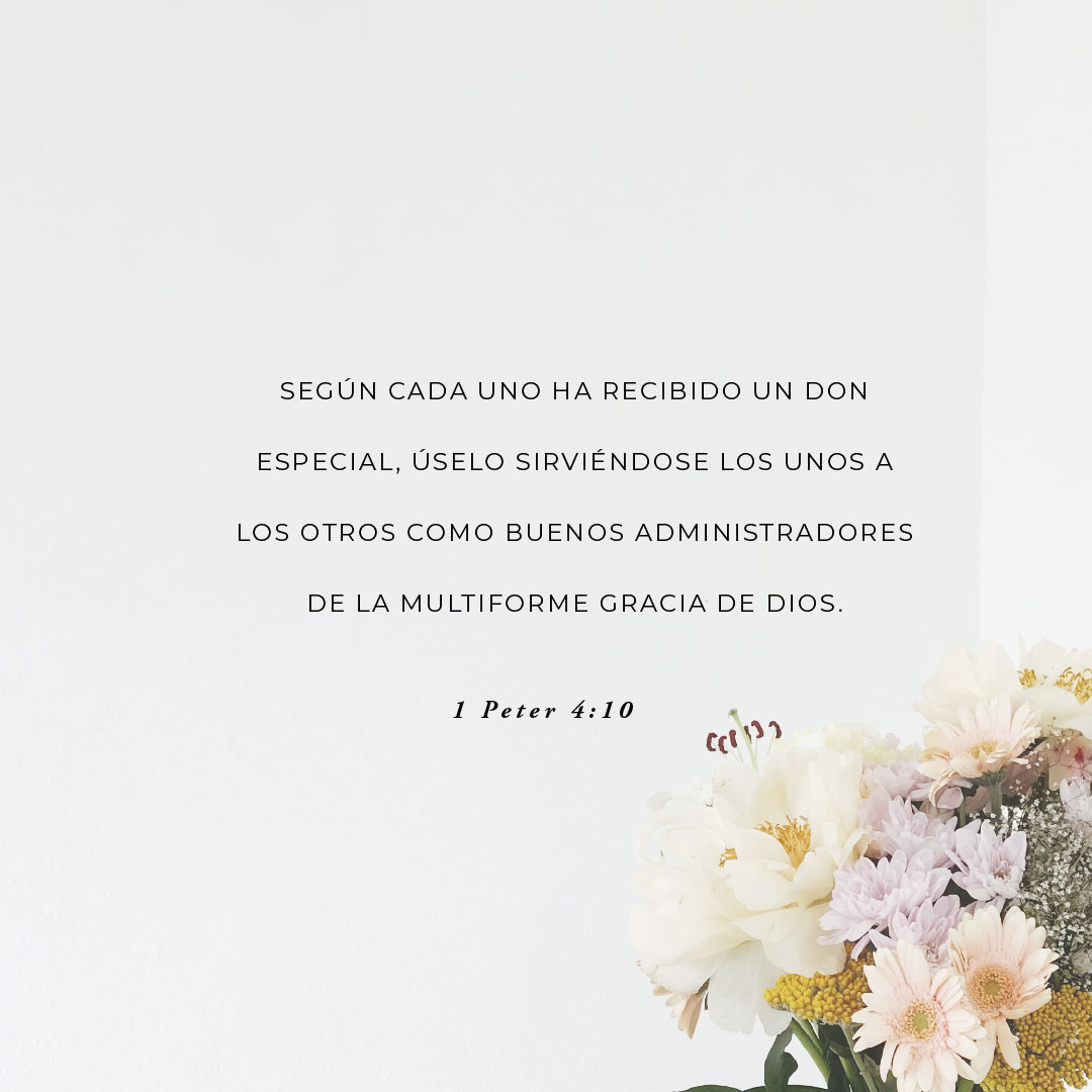 Y ante todo, tened entre vosotros ferviente amor, porque el amor cubrirá multitud de pecados. Practicad con amor la hospitalidad los unos a los otros sin murmuraciones. Cada uno según el don que ha recibido, ponedlo al servicio de los demás entre vosotros mismos, como buenos administradores de la variada gracia de Dios.
