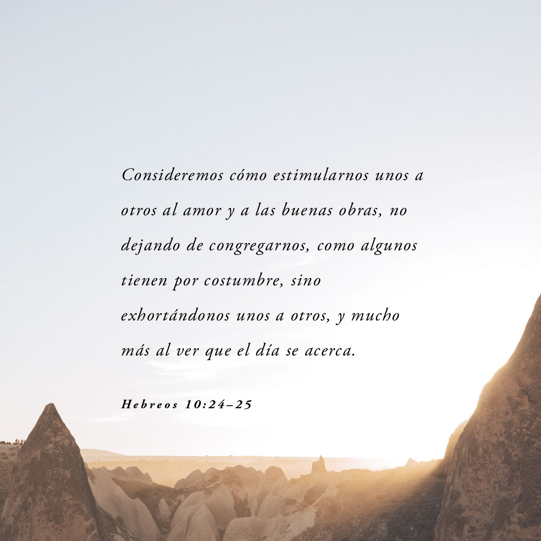 Y tengámonos en cuenta unos a otros para estimularnos al amor y a las buenas obras. 25 No dejemos de congregarnos, como algunos tienen por costumbre; al contrario, animémonos unos a otros, y tanto más, cuanto veis que aquel día se acerca.