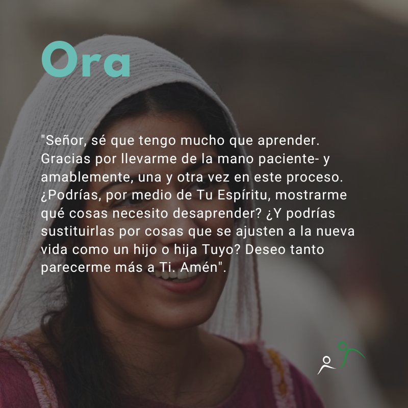 Ora: "Señor, sé que tengo mucho que aprender. Gracias por llevarme de la mano paciente y amablemente, una y otra vez en este proceso. ¿Podrías, por medio de Tu Espíritu, mostrarme qué cosas necesito desaprender? ¿Y podrías sustituirlas por cosas que se ajusten a la nueva vida como un hijo o hija Tuyo? Deseo tanto parecerme más a Ti. Amén".