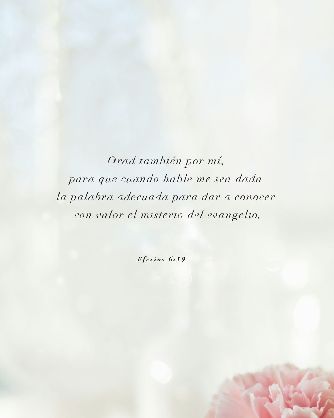 En Efesios 6:19, Pablo pide oración para que tenga valor cada día para hablar del evangelio con valentía donde quiera que se encuentre. Pablo nos muestra que, sin la ayuda de Dios, no podemos hacer nada, y que debemos mantener constantemente el evangelio al frente de nuestras mentes y vidas.