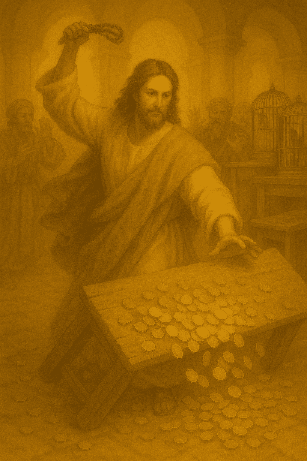 Jesús entra al templo y encuentra un mercado: cambistas, vendedores de animales, ruido y corrupción. Con autoridad, vuelca las mesas y expulsa a los comerciantes, citando (Isaías 56:7). Mi casa será llamada casa de oración, y (Jeremías 7:11), pero vosotros la habéis hecho cueva de ladrones. Este acto no fue solo físico, sino profético: una purificación del culto y una denuncia de la hipocresía religiosa.