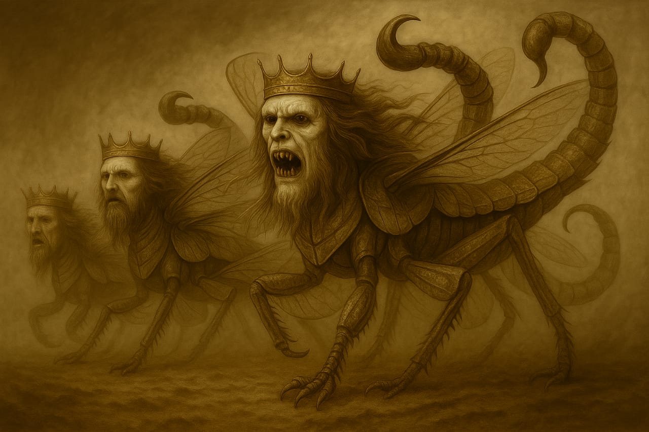 Quinta trompeta (Primer "Ay"): Langostas con poder de escorpiones emergen del abismo y atormentan a los hombres que no tienen el sello de Dios en sus frentes durante cinco meses.