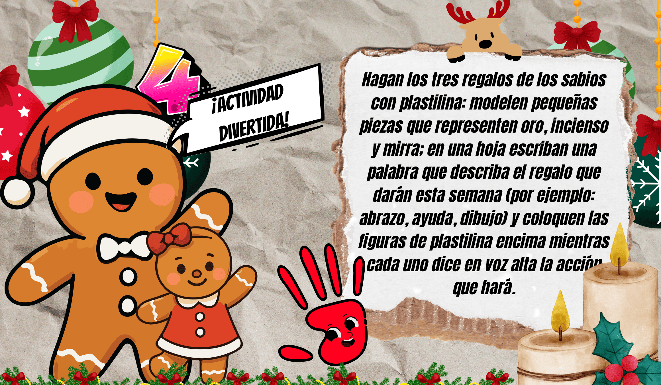 Piensa en qué regalo de amistad o cariño puedes ofrecer esta semana y compártelo con tu familia; cuenta la historia de los sabios y pregunta a todos qué regalo sencillo harían ellos; así la casa se llena de ideas buenas y todos descubren que compartir es el mejor tesoro.