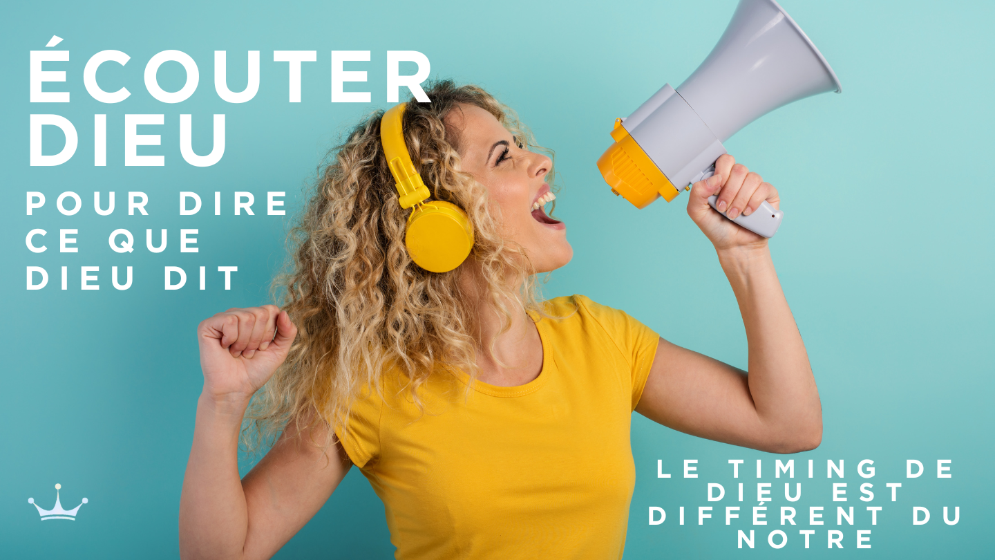 Un des défis de savoir écouter Dieu afin de redire ce qu’Il dit est la question du timing, car nous sommes dans une dimension temporelle alors que Dieu est hors du temps. Il est dans l’éternité, ce qui veut dire que le temps n’existe plus... Il est en même temps dans le hier, l’aujourd’hui et le demain. C’est pour cela que parfois Dieu nous dit des choses qui semblent tellement réelles qu’on croit que c’est pour tout de suite alors que c’est pour bien plus tard... C’est ce qui permet à Esaïe de décrire, comme si l’avait vu (car écouter Dieu, c’est aussi voir), Jésus sur la croix plusieurs centaines d’années avant (cf Esaïe 53).