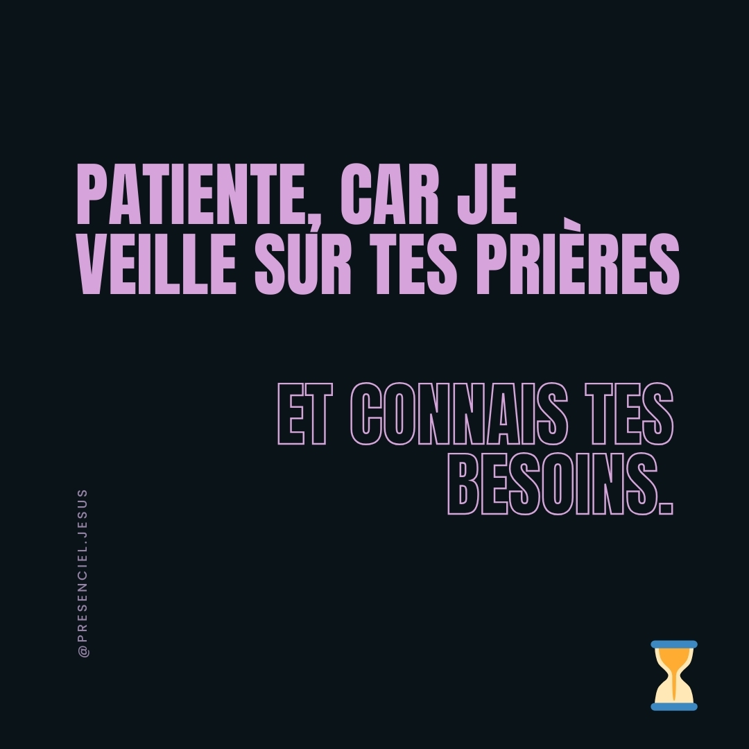 Lorsque tu fais face à des moments difficiles, souviens-toi que je suis la source de la patience : "Le fruit de l'Esprit est amour, joie, paix, patience, bonté, bienveillance, fidélité" (Galates 5:22).