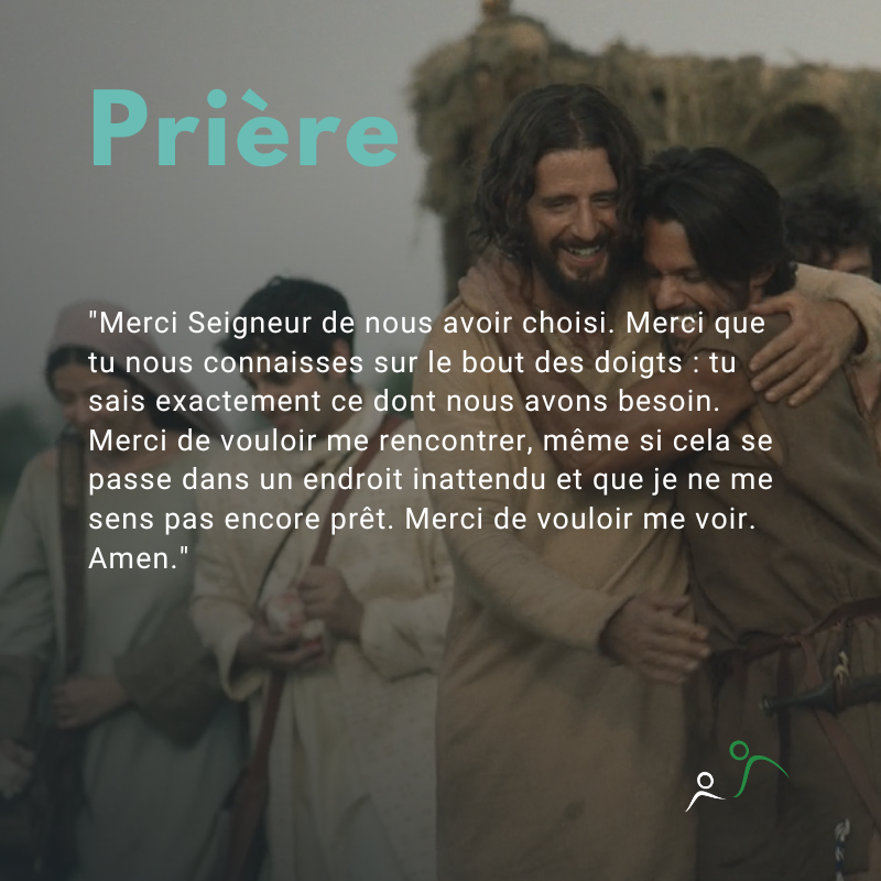Prière : "Merci Seigneur de nous avoir choisi. Merci que tu nous connaisses sur le bout des doigts : tu sais exactement ce dont nous avons besoin. Merci de vouloir me rencontrer, même si cela se passe dans un endroit inattendu et que je ne me sens pas encore prêt. Merci de vouloir me voir. Amen."