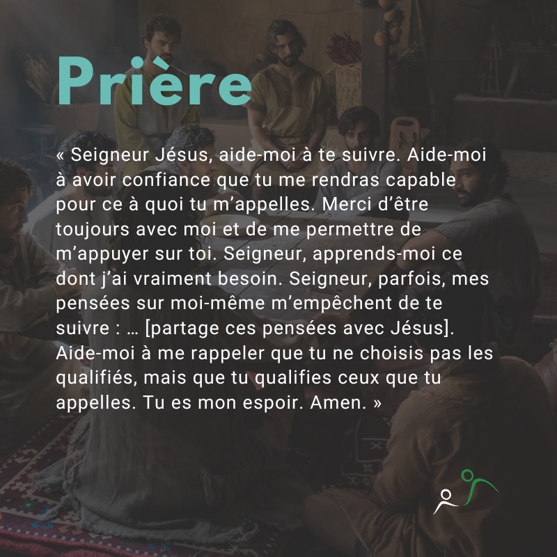 Prière: « Seigneur Jésus, aide-moi à te suivre. Aide-moi à avoir confiance que tu me rendras capable pour ce à quoi tu m'appelles. Merci d'être toujours avec moi et de me permettre de m'appuyer sur toi. Seigneur, apprends-moi ce dont j'ai vraiment besoin. Seigneur, parfois, mes pensées sur moi-même m'empêchent de te suivre : . [partage ces pensées avec Jésus]. Aide-moi à me rappeler que tu ne choisis pas les qualifiés, mais que tu qualifies ceux que tu appelles. Tu es mon espoir. Amen. »