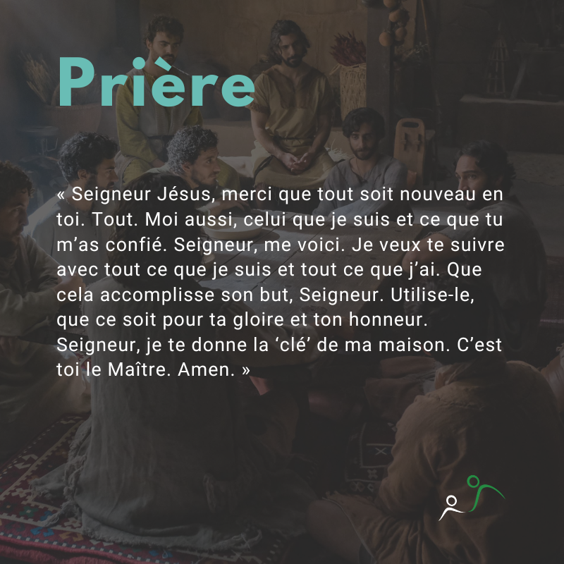 Prière: « Seigneur Jésus, merci que tout soit nouveau en toi. Tout. Moi aussi, celui que je suis et ce que tu m'as confié. Seigneur, me voici. Je veux te suivre avec tout ce que je suis et tout ce que j'ai. Que cela accomplisse son but, Seigneur. Utilise-le, que ce soit pour ta gloire et ton honneur. Seigneur, je te donne la 'clé' de ma maison. C'est toi le Maître. Amen. »
