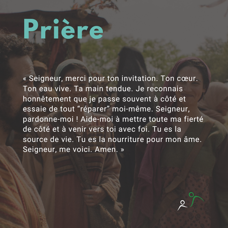 Prière: « Seigneur, merci pour ton invitation. Ton cœur. Ton eau vive. Ta main tendue. Je reconnais honnêtement que je passe souvent à côté et essaie de tout "réparer" moi-même. Seigneur, pardonne- moi ! Aide-moi à mettre toute ma fierté de côté et à venir vers toi avec foi. Tu es la source de vie. Tu es la nourriture pour mon âme. Seigneur, me voici. Amen. »