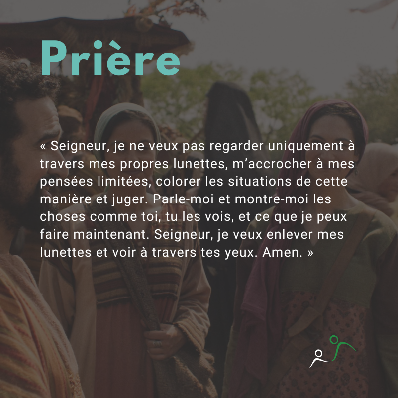 Prière: « Seigneur, je ne veux pas regarder uniquement à travers mes propres lunettes, m'accrocher à mes pensées limitées, colorer les situations de cette manière et juger. Parle-moi et montre- moi les choses comme toi, tu les vois, et ce que je peux faire maintenant. Seigneur, je veux enlever mes lunettes et voir à travers tes yeux. Amen. »
