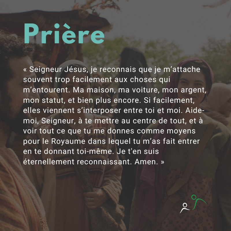 Prière: « Seigneur Jésus, je reconnais que je m'attache souvent trop facilement aux choses qui m'entourent. Ma maison, ma voiture, mon argent, mon statut, et bien plus encore. Si facilement, elles viennent s'interposer entre toi et moi. Aide-moi, Seigneur, à te mettre au centre de tout, et à voir tout ce que tu me donnes comme moyens pour le Royaume dans lequel tu m'as fait entrer en te donnant toi-même. Je t'en suis éternellement reconnaissant. Amen. »