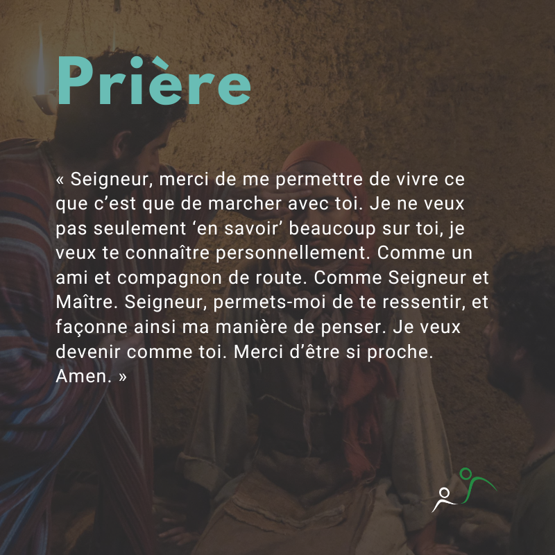 Prière: « Seigneur, merci de me permettre de vivre ce que c'est que de marcher avec toi. Je ne veux pas seulement 'en savoir' beaucoup sur toi, je veux te connaître personnellement. Comme un ami et compagnon de route. Comme Seigneur et Maître. Seigneur, permets-moi de te ressentir, et façonne ainsi ma manière de penser. Je veux devenir comme toi. Merci d'être si proche. Amen. »