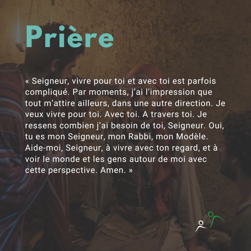 Prière: « Seigneur, vivre pour toi et avec toi est parfois compliqué. Par moments, j'ai l'impression que tout m'attire ailleurs, dans une autre direction. Je veux vivre pour toi. Avec toi. A travers toi. Je ressens combien j'ai besoin de toi, Seigneur. Oui, tu es mon Seigneur, mon Rabbi, mon Modèle. Aide-moi, Seigneur, à vivre avec ton regard, et à voir le monde et les gens autour de moi avec cette perspective. Amen. »