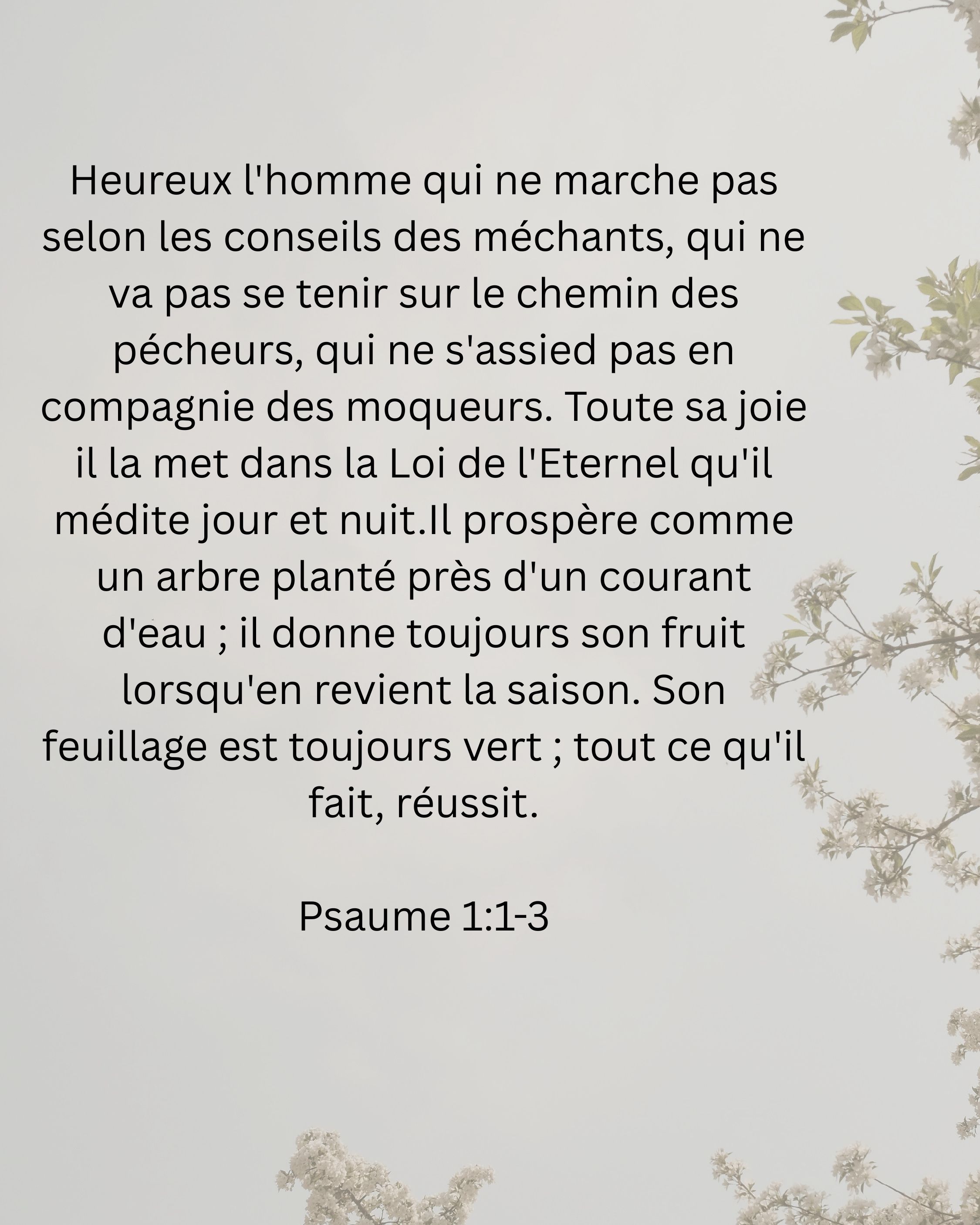 Heureux l'homme qui ne marche pas selon les conseils des méchants, qui ne va pas se tenir sur le chemin des pécheurs, qui ne s'assied pas en compagnie des moqueurs. Toute sa joie il la met dans la Loi de l'Eternel qu'il médite jour et nuit.Il prospère comme un arbre planté près d'un courant d'eau ; il donne toujours son fruit lorsqu'en revient la saison. Son feuillage est toujours vert ; tout ce qu'il fait, réussit.