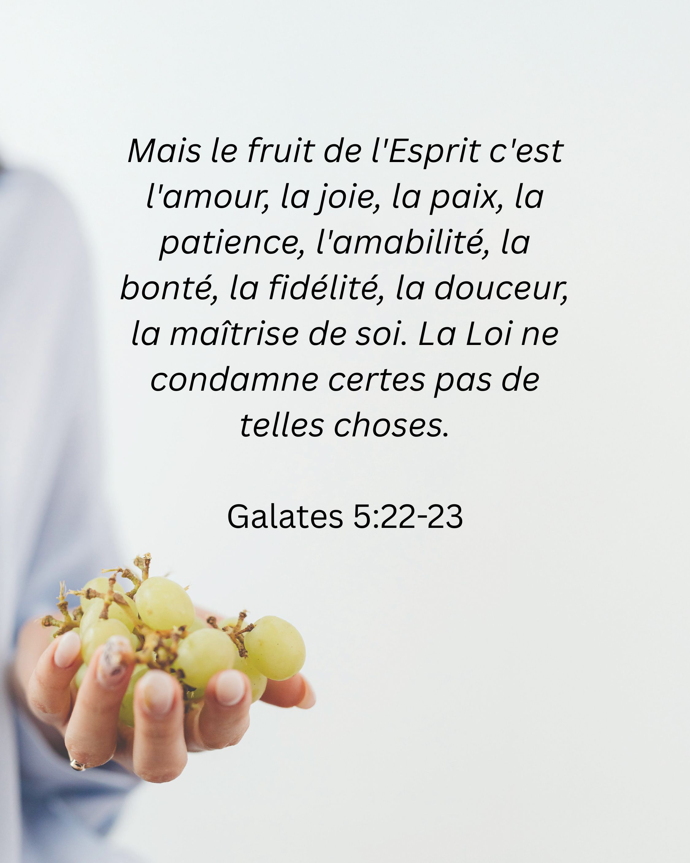Galates 5:22-23 nous donne un aperçu du fruit spirituel que Dieu veut faire croître en nous et à travers nous. Cette liste n'est pas exhaustive, mais c'est un bon résumé du fruit qui grandira dans la vie d'un chrétien - un caractère pieux. Certaines de ces caractéristiques, ou « fruits », sont l'amour, la joie, la paix, la patience, la gentillesse, la bonté, la fidélité, la douceur et la maîtrise de soi.