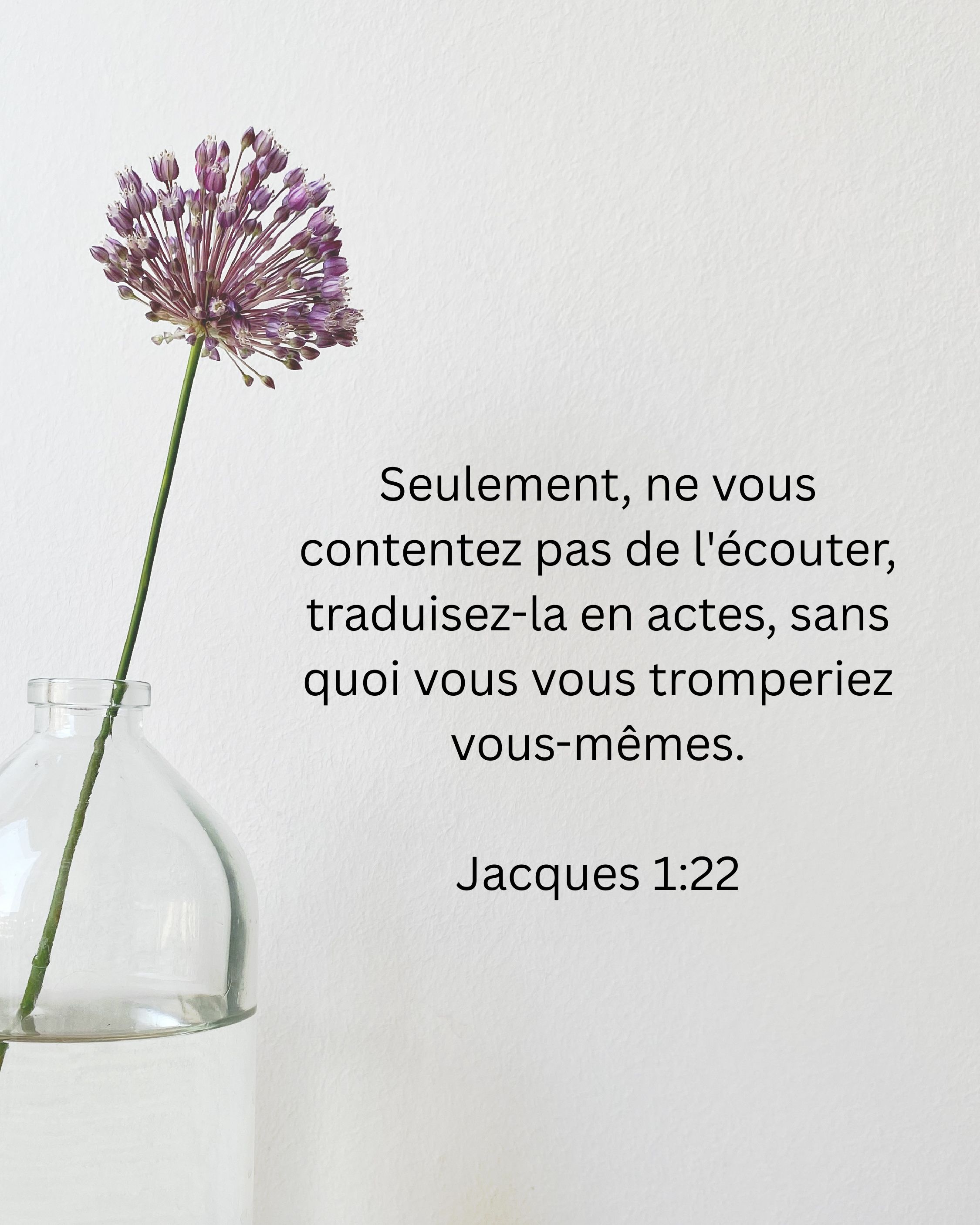 Cher Jésus, aide-moi à être plus qu'une simple auditrice de Ta Parole. Donne-moi le courage de la vivre chaque jour et de demeurer en Toi en marchant dans l'obéissance. Amen.