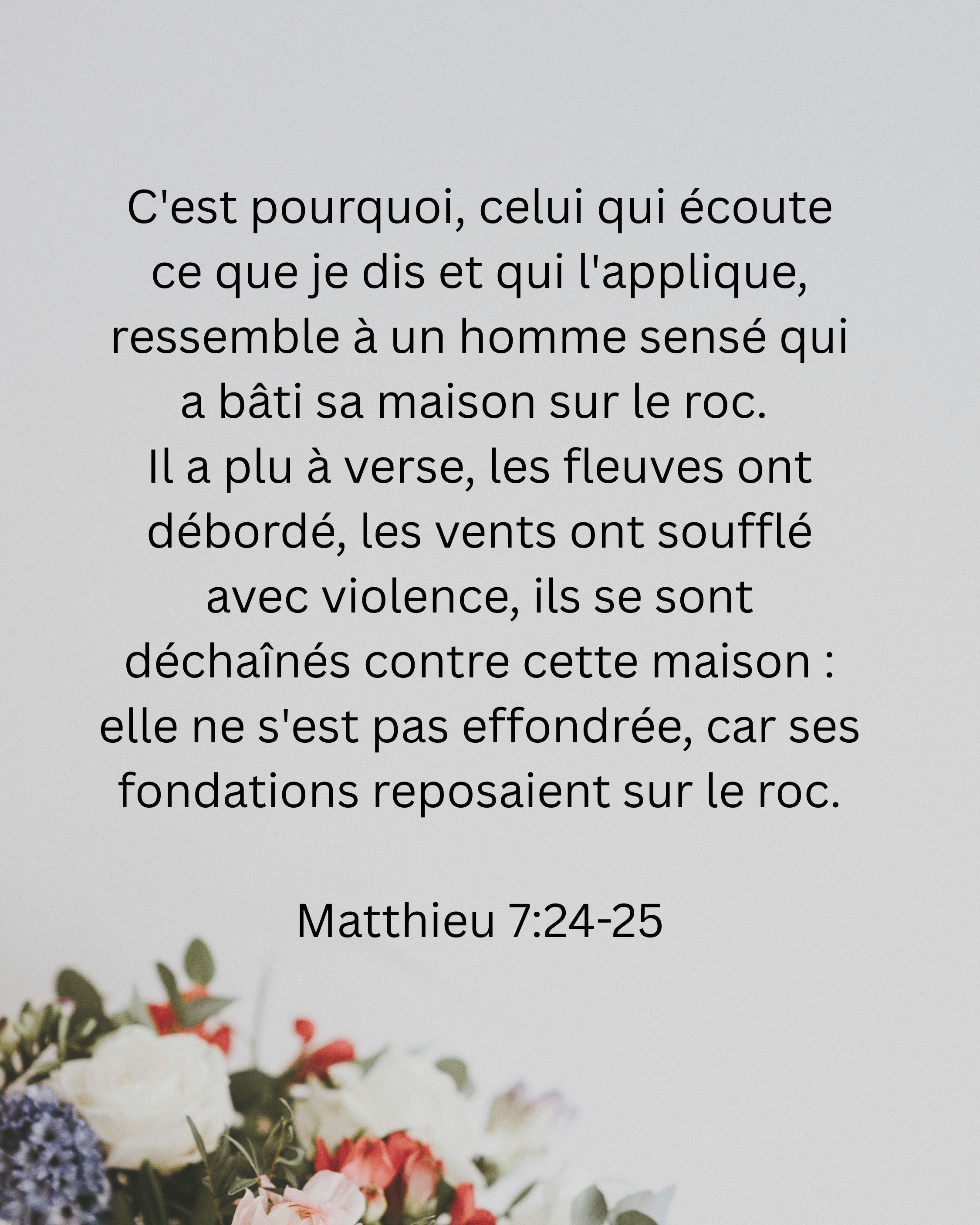 C'est pourquoi, celui qui écoute ce que je dis et qui l'applique, ressemble à un homme sensé qui a bâti sa maison sur le roc. Il a plu à verse, les fleuves ont débordé, les vents ont soufflé avec violence, ils se sont déchaînés contre cette maison : elle ne s'est pas effondrée, car ses fondations reposaient sur le roc.