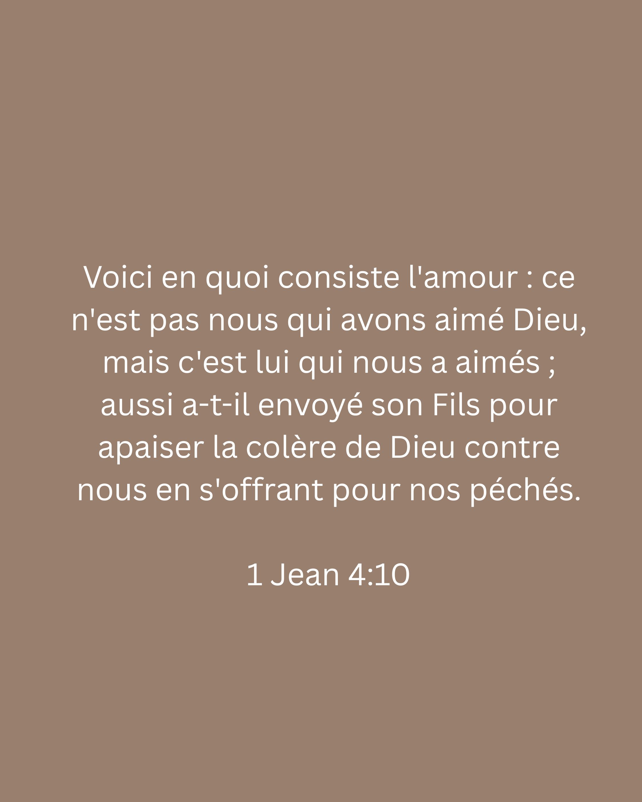 Voici en quoi consiste l'amour : ce n'est pas nous qui avons aimé Dieu, mais c'est lui qui nous a aimés ; aussi a-t-il envoyé son Fils pour apaiser la colère de Dieu contre nous en s'offrant pour nos péchés.