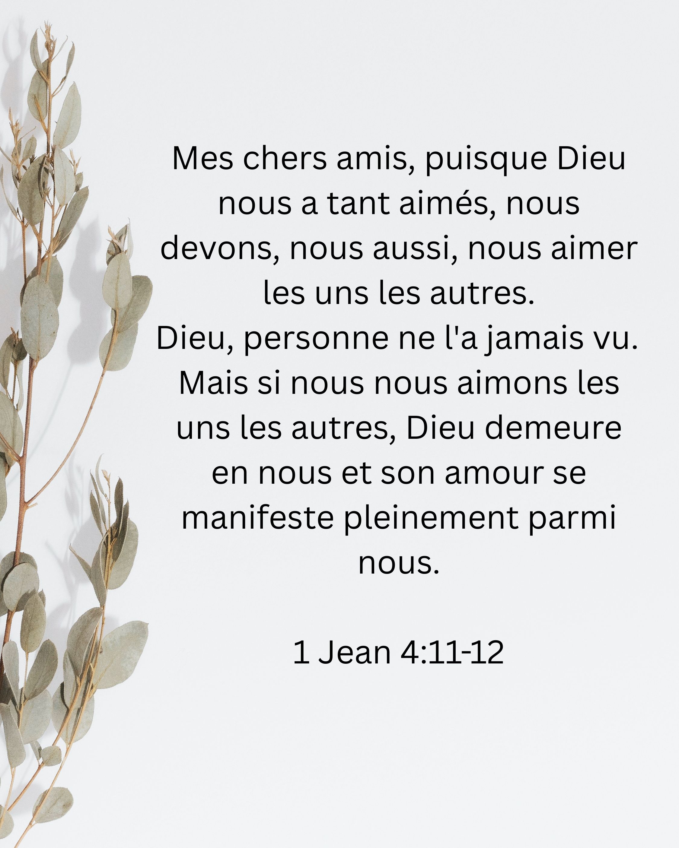 Dieu, personne ne l'a jamais vu. Mais si nous nous aimons les uns les autres, Dieu demeure en nous et son amour se manifeste pleinement parmi nous.