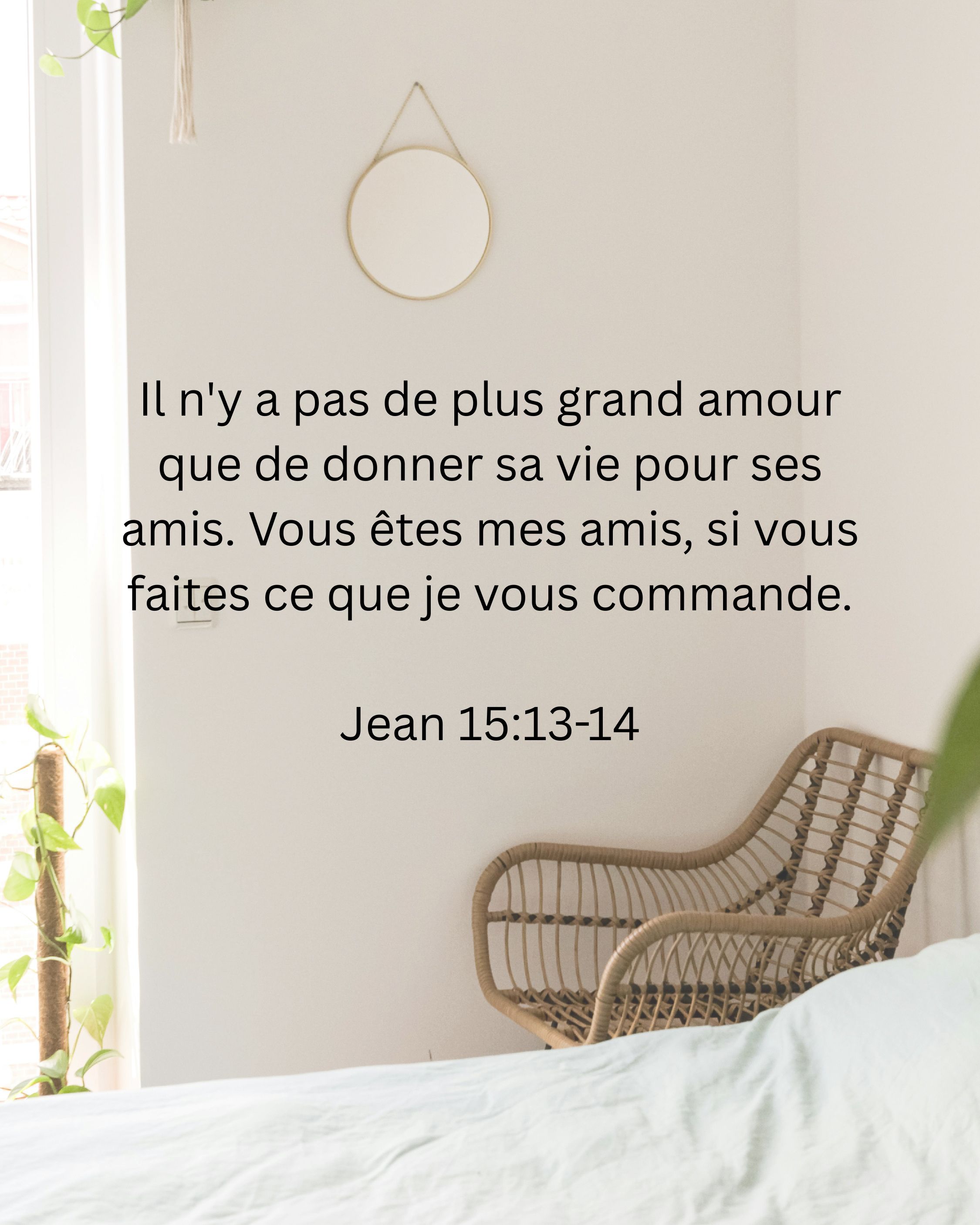 Christ appelle tous les croyants à s'aimer les uns les autres comme Il a aimé l'Église. Tout au long de cette semaine, à qui pouvez-vous montrer l'amour de Christ ? Prévoyez d'appeler ou d'envoyer un SMS à un(e) ami(e) pour l'encourager, de faire un acte de gentillesse au hasard ou de vous inscrire pour servir dans votre église ou dans un ministère local. Il y a tant de façons de montrer l'amour de Christ au monde qui nous regarde !