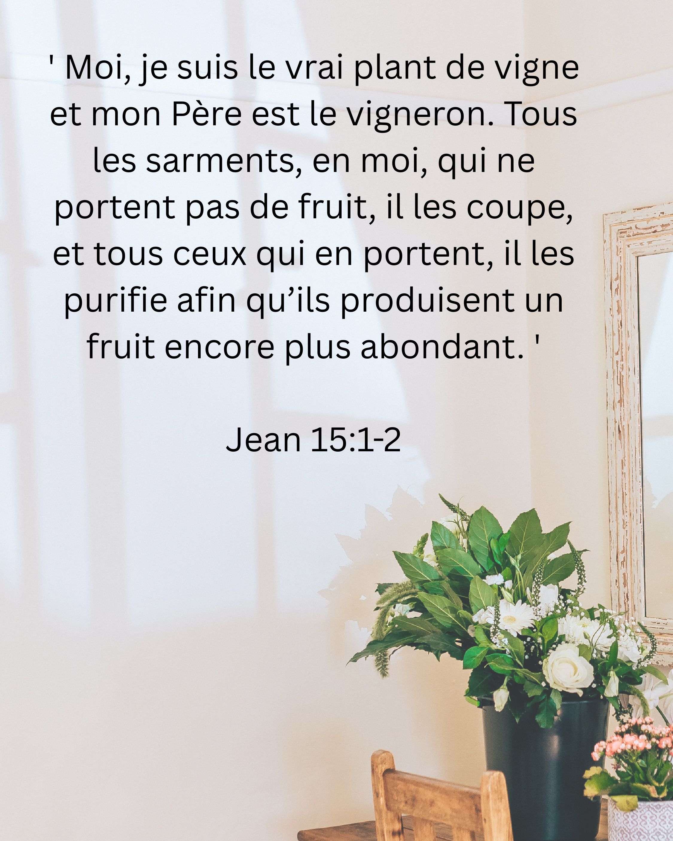 Cette semaine, consacrez du temps au calme et à la prière. Demandez à Dieu où Il veut vous émonder en cette saison. Priez et donnez-Lui cette chose spécifique et demandez au Saint-Esprit d’être à l’œuvre dans votre cœur et votre vie. Assurez-vous de partager avec un(e) ami(e) croyant(e) et de confiance pour vous aider à vous responsabiliser et à voir où Dieu est à l’œuvre.