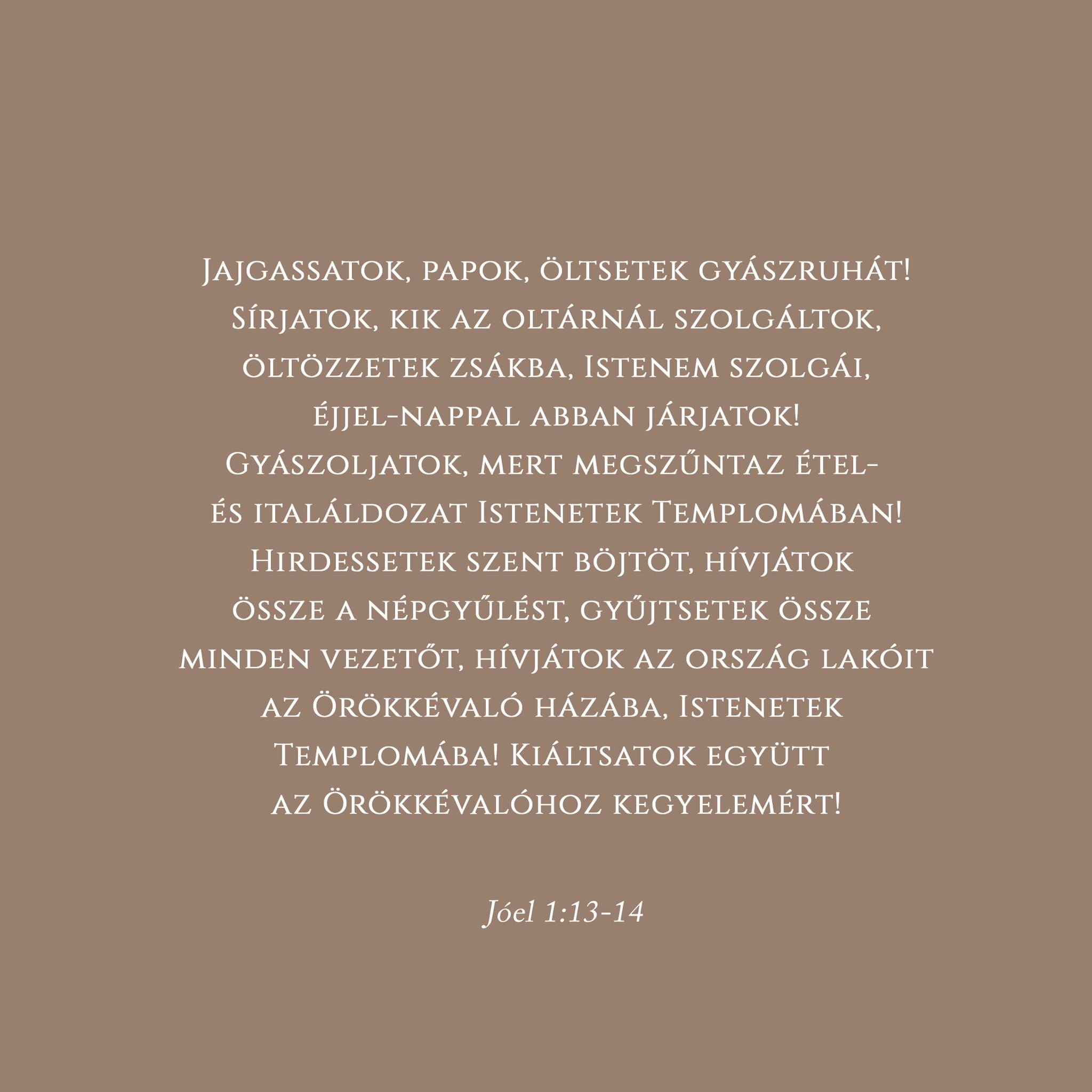 „Jajgassatok, papok, öltsetek gyászruhát! Sírjatok, kik az oltárnál szolgáltok, öltözzetek zsákba, Istenem szolgái, éjjel-nappal abban járjatok! Gyászoljatok, mert megszűnt az étel- és italáldozat Istenetek Templomában! Hirdessetek szent böjtöt, hívjátok össze a népgyűlést, gyűjtsetek össze minden vezetőt, hívjátok az ország lakóit az Örökkévaló házába, Istenetek Templomába! Kiáltsatok együtt az Örökkévalóhoz kegyelemért!”