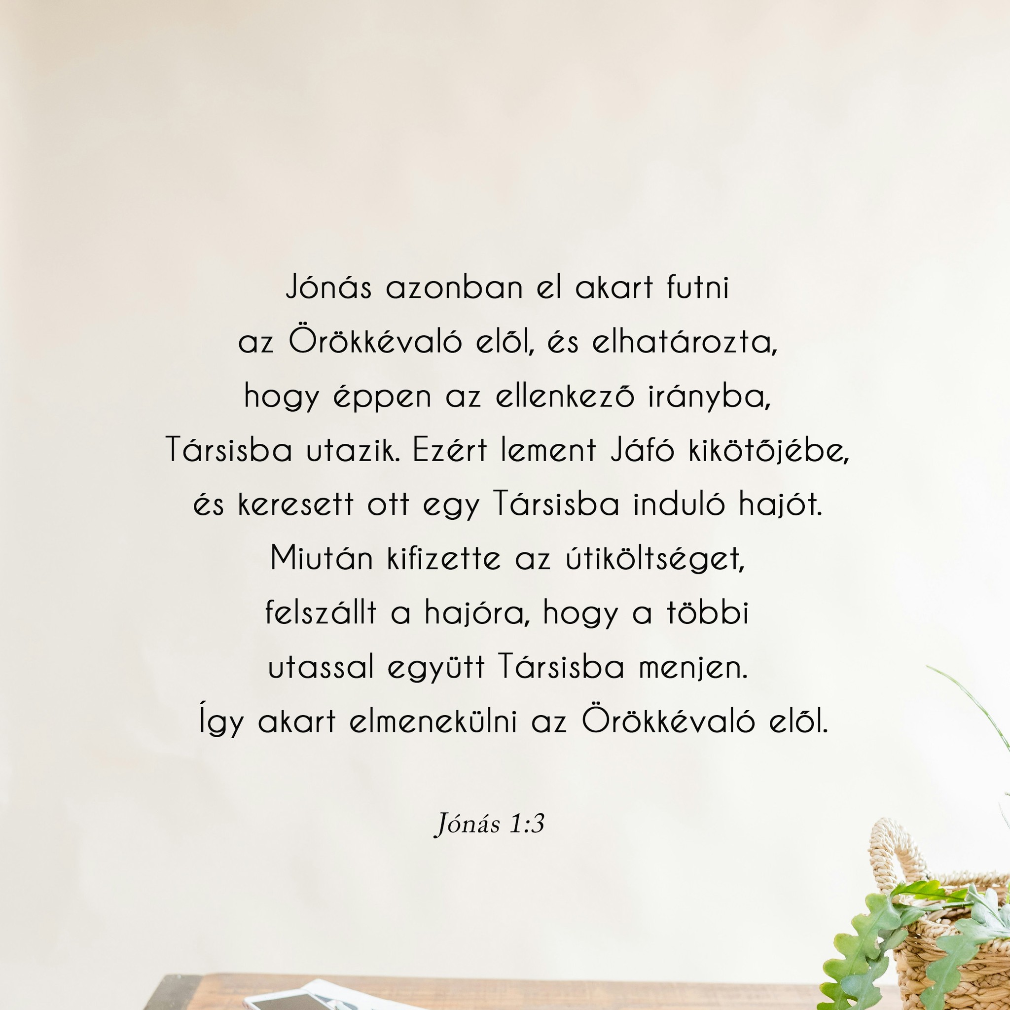 „Jónás azonban azonnal el akart futni az Örökkévaló elől, és elhatározta, hogy éppen az ellenkező irányba, Társisba utazik. Ezért lement Jáfó kikötőjébe, és keresett ott egy Társisba induló hajót. Miután kifizette az útiköltséget, felszállt a hajóra, hogy a többi utassal együtt Társisba menjen. Így akart elmenekülni az Örökkévaló elől.”