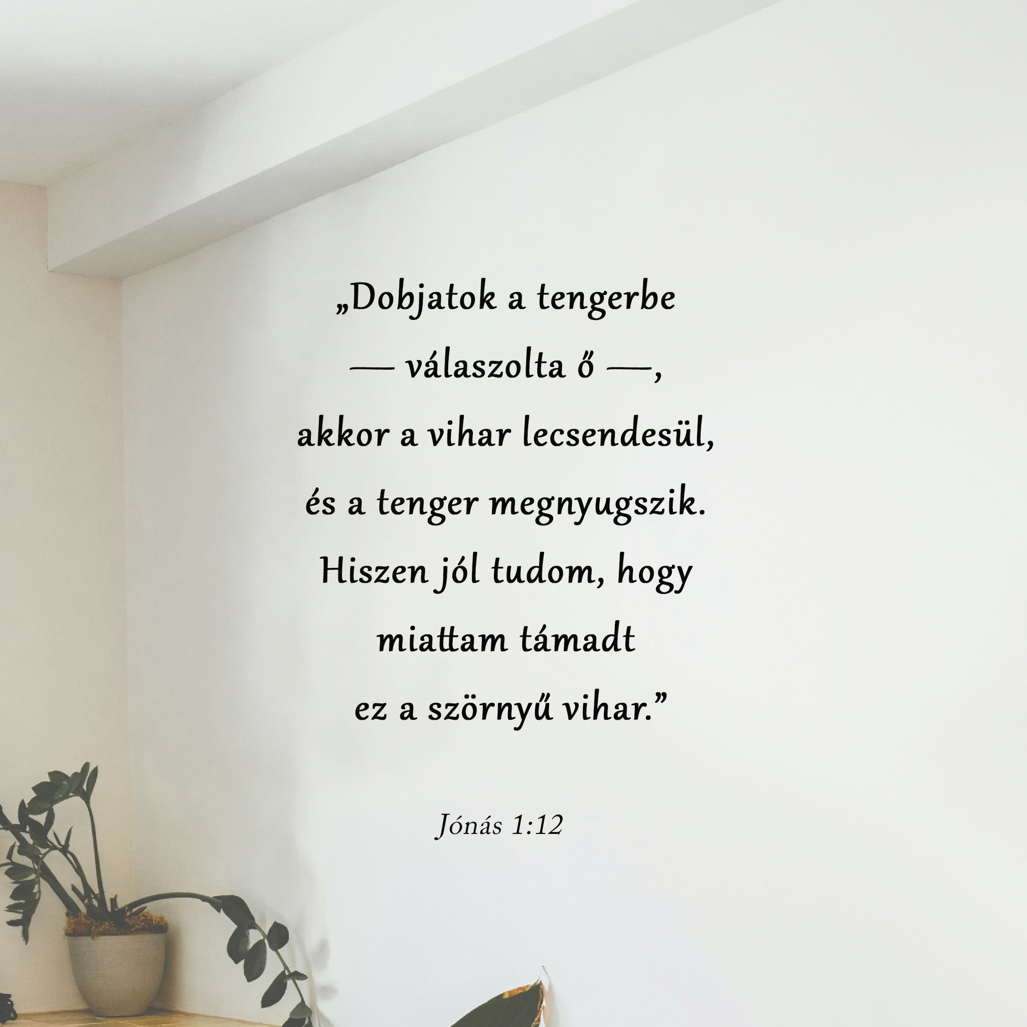 „Dobjatok a tengerbe – válaszolta ő - , akkor a vihar lecsendesül, és a tenger megnyugszik. Hiszen jól tudom, hogy miattam támadt ez a szörnyű vihar.”