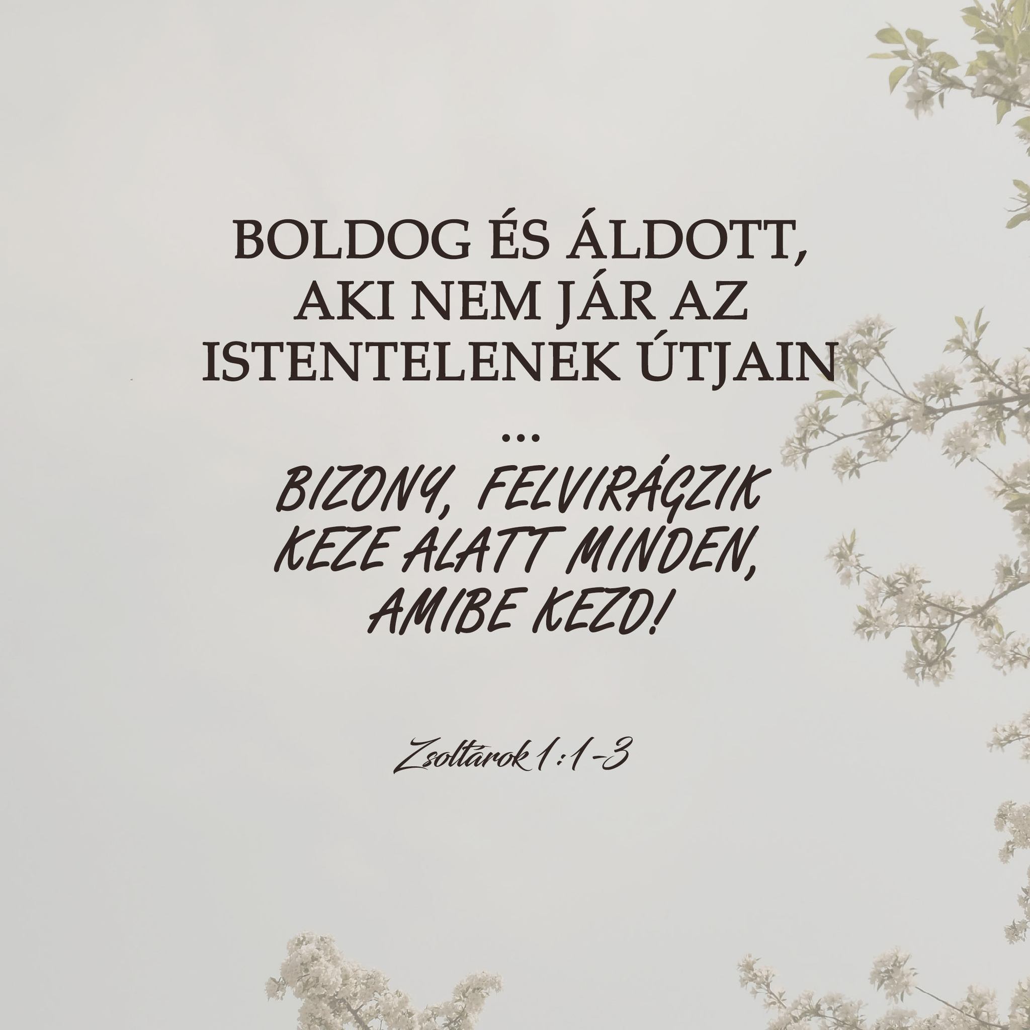 „Boldog és áldott, aki nem jár az istentelenek útjain, nem áll rá a bűnösök ösvényeire, és nem ül együtt a gúnyolódókkal, hanem abban leli örömét, ha az Örökkévaló tanítja, és éjjel-nappal azon gondolkodik. Olyan életerős lesz, mint a folyópartra ültetett gyümölcsfa: idejében hoz gyümölcsöt, s levelei örökké zöldellnek. Bizony, felvirágzik keze alatt minden, amibe kezd!”