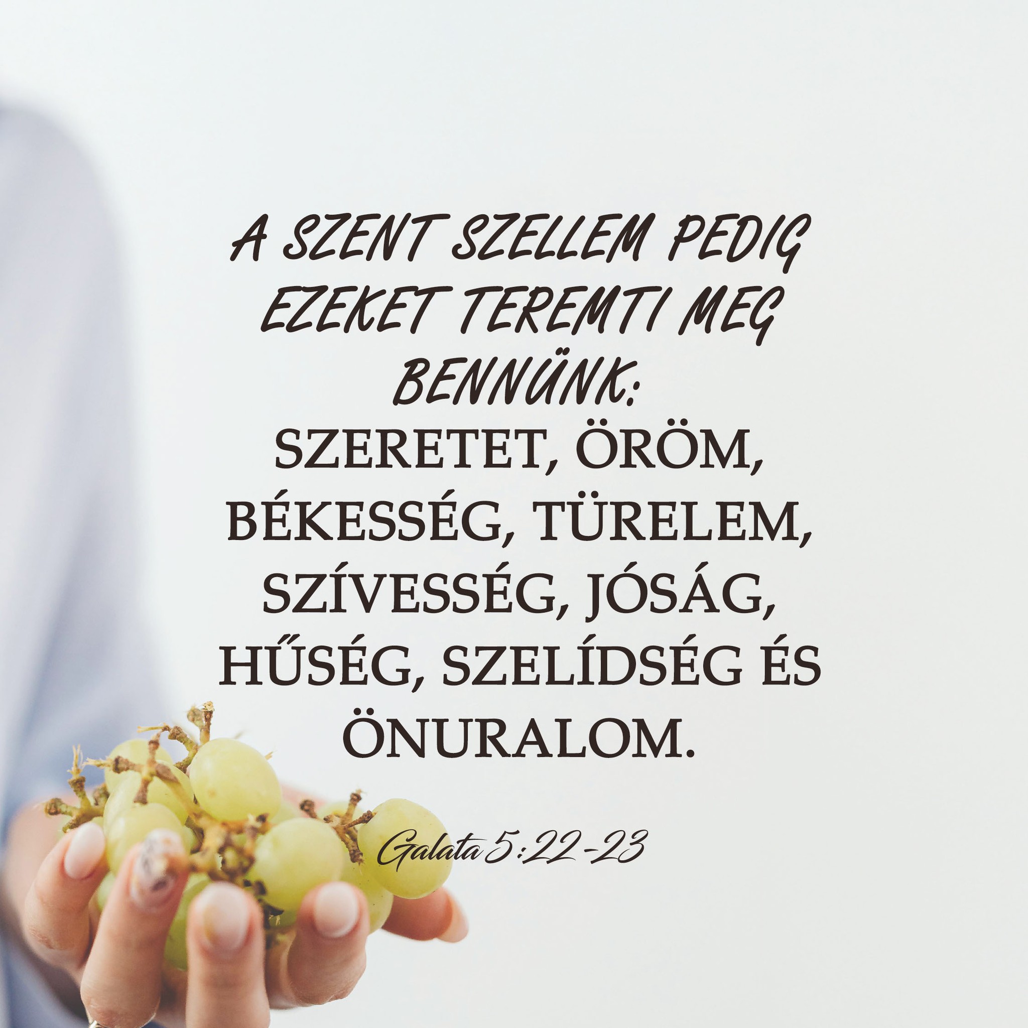 „A Szent Szellem pedig ezeket teremti meg bennünk: szeretet, öröm, békesség, türelem, szívesség, jóság, hűség, szelídség és önuralom. Nincs olyan törvény, amely ezeket elítélné.”